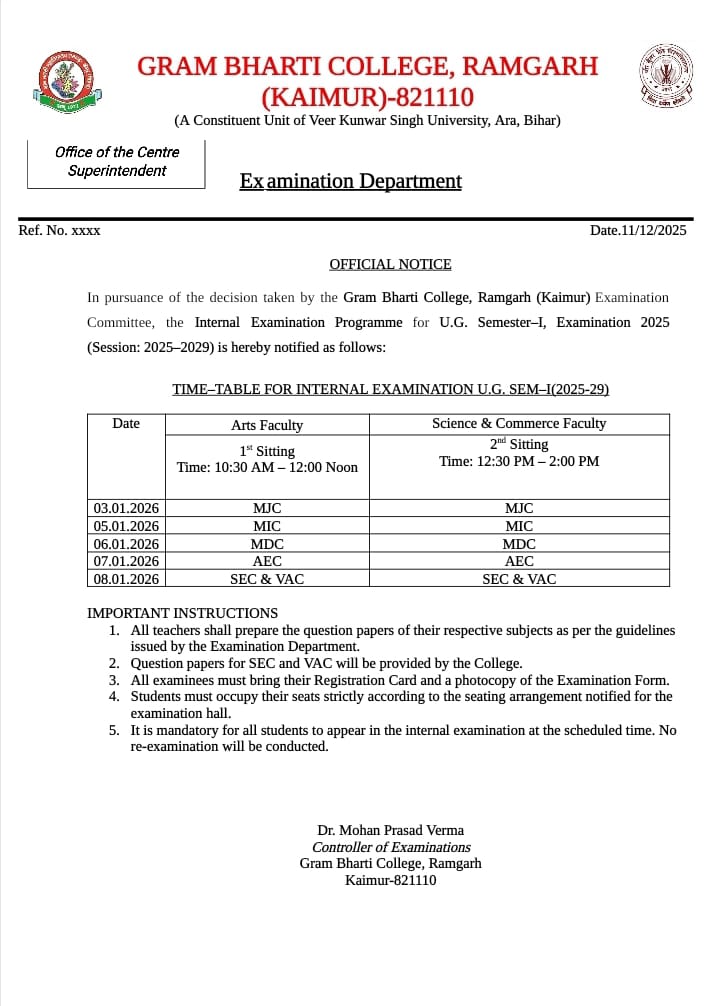 Time-Table for Internal Examination, UG Sem-I Session-2025-29; Dated - 02/01/2026 |